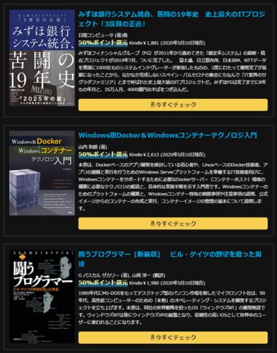 翔泳社と日経のIT・コンピュータ・プログラミング技術書Kindle大規模セールが今日2020/5/10(日)まで開催中!急げ! 上級者向けの高品質高額本多数含むラインナップ。要チェック! 日経Kindle技術書50%ポイント還元:上級者向け多数800冊以上対象(2020/5/10ま…