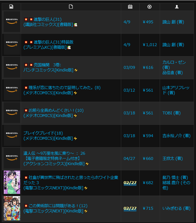2020-02-13 2020/2/13(木)マンガ予約開始速報⇒進撃の巨人31巻書籍版、売国機関3Kindle版など予約スタート! Amazon Kindle 予約 マンガ 進撃の巨人 新刊 売国機関 2020/2/13(木)マンガ予約スタート速報! レジェンド「進撃の巨人」31巻通常版と特装版が書籍版から予約スタート!4/9発売予定。 Kindle版の人気作は幼女戦記でおなじみカルロ・ゼン氏原作「売国機関」3巻、メテオCOMICSのメディア化作品「理系が恋に落ちたので証明してみた。」8巻、「お前ら全員めんどくさい!」10、「ブレイクブレイド」18などが予約スタート。 予約受付中の人気作書籍版とKindle版まとめてチェック! www.shinentai.com